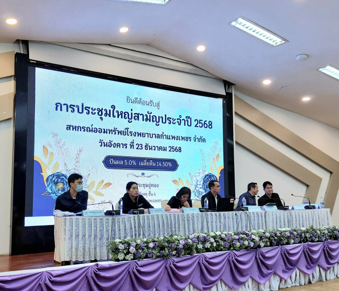 นางสาววิไล ขัติมะ ผู้อำนวยการกลุ่มส่งเสริมสหกรณ์ 1 พร้อมคณะ เข้าร่วมประชุมใหญ่สามัญประจำปี 2568 สหกรณ์ออมทรัพย์โรงพยาบาลกำแพงเพชร จำกัด สำหรับปีบัญชีสิ้นสุดวันที่ 30 พฤศจิกายน 2568 ได้แนะนำส่งเสริมการบริหารธุรกิจสินเชื่อของสหกรณ์ และการนำเงินของสหกรณ์ไปฝากหรือลงทุนให้เป็นไปตามกฎหมาย ข้อบังคับและระเบียบของสหกรณ์