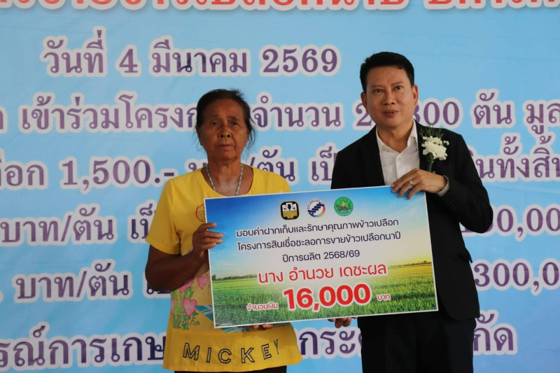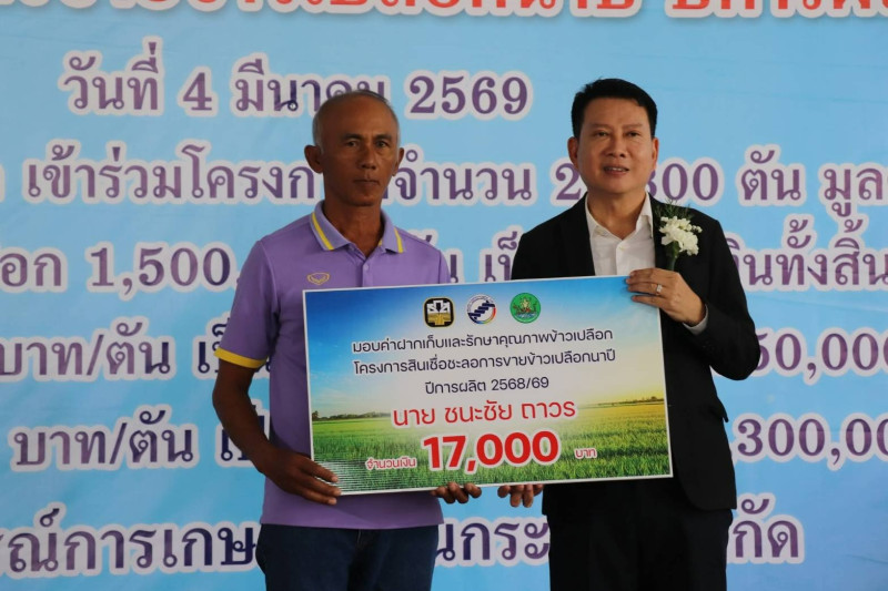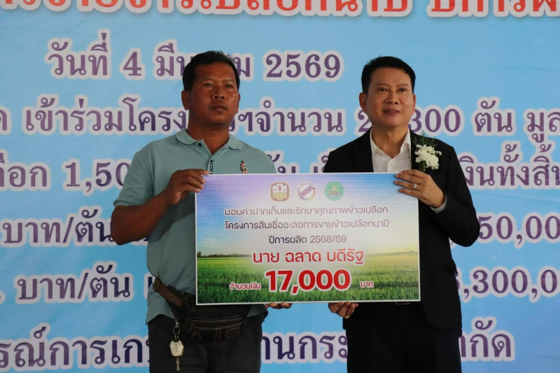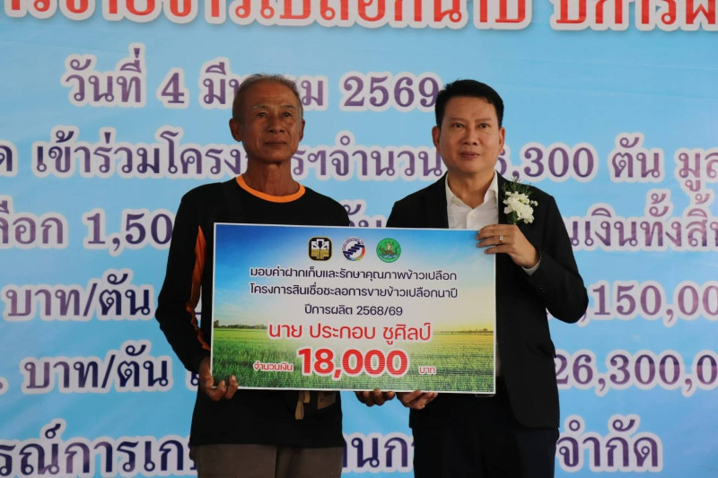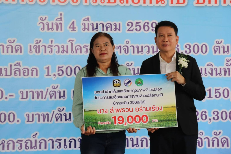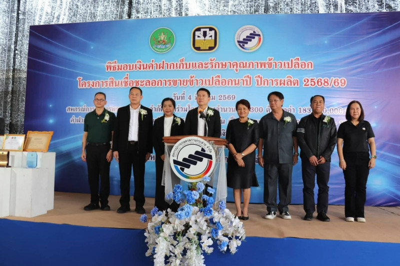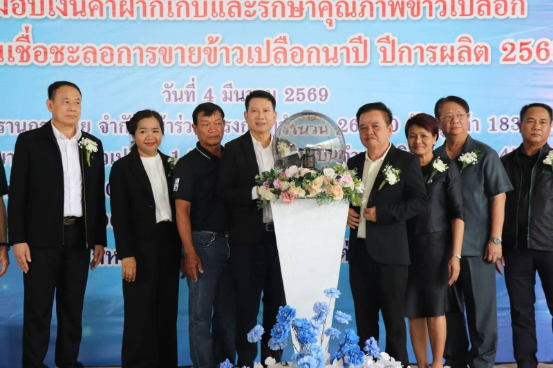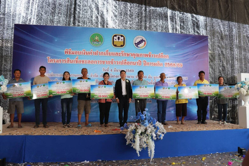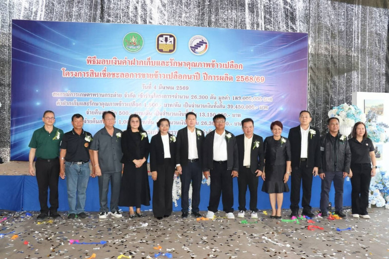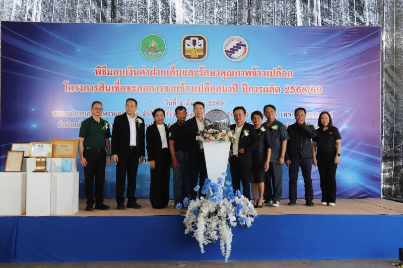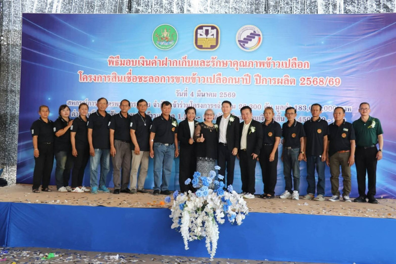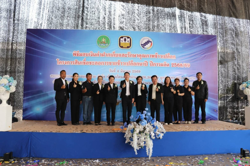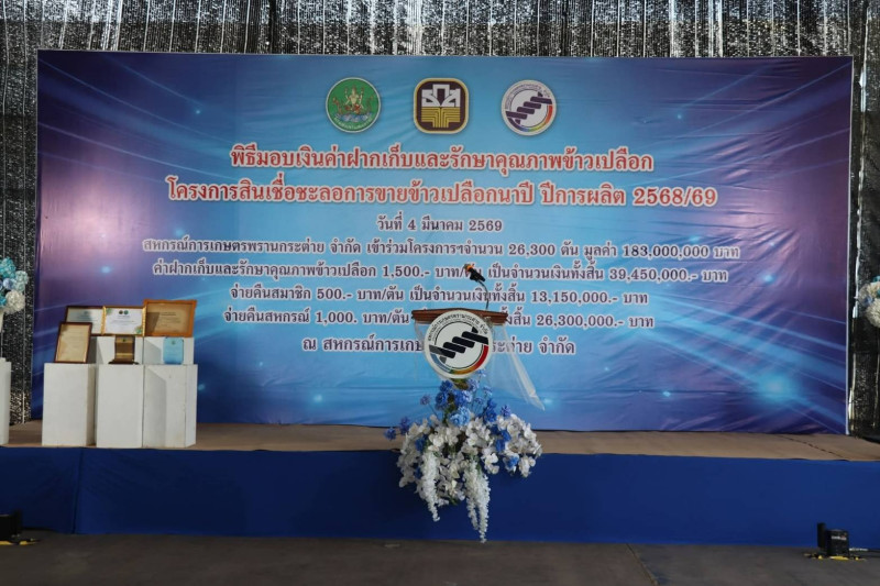 วันที่ 4 มีนาคม 2569 นางสาวมณฑาทิพย์ บัวเทศ สหกรณ์จังหวัดกำแพงเพชร พร้อมด้วยบุคลากรเข้าร่วมพิธีมอบค่าฝากเก็บและรักษาคุณภาพข้าวเปลือก ตามโครงการสินเชื่อชะลอการขายข้าวเปลือกนาปี ปีการผลิต 2568/69 โดยสหกรณ์การเกษตรพรานกระต่าย จำกัด นำโดยนายสุพจน์ เดชะผล ผู้จัดการสหกรณ์การเกษตรพรานกระต่าย จำกัด พร้อมด้วยคณะกรรมการ และเจ้าหน้าที่ สหกรณ์การเกษตรพรานกระต่าย จำกัด ดำเนินการจัดพิธีมอบค่าฝากเก็บและรักษาคุณภาพข้าวเปลือกฯ โดยมีนายสดุดี พุทธัง ปลัดจังหวัดกำแพงเพชร เป็นประธาน ในการมอบค่าฝากเก็บและรักษาคุณภาพข้าวเปลือก ตามโครงการสินเชื่อชะลอการขายข้าวเปลือกนาปี ปีการผลิต 2568/69 ให้แก่สมาชิกเกษตรกร เพื่อสร้างขวัญและกำลังใจแก่ผู้ปลูกข้าว ตลอดจนประชาสัมพันธ์ผลการดำเนินโครงการ และเสริมสร้างความร่วมมือระหว่างสหกรณ์ หน่วยงานภาครัฐ และสมาชิกเกษตรกร ในการรักษาเสถียรภาพราคาข้าวและยกระดับคุณภาพผลผลิตอย่างยั่งยืน โดยมีปริมาณข้าวเปลือกที่เข้าร่วมโครงการรวมทั้งสิ้น 26,300 ตัน รวมเป็นมูลค่า 183,000,000 บาท และได้รับค่าฝากเก็บและรักษาคุณภาพข้าวเปลือกในอัตรา 1,500 บาท / ต่อตัน เป็นจำนวนเงินทั้งสิ้น 39,450,000 บาท และได้จัดสรร ดังนี้ จ่ายคืนให้สมาชิกเกษตรกร จำนวน 500 บาท/ต่อตัน เป็นจำนวนเงินทั้งสิ้น 13,150,000 บาท และจ่ายคืนให้สหกรณ์ฯ จำนวน 1,000 บาท/ต่อตัน เป็นจำนวนเงินทั้งสิ้น 26,300,000 บาท ณ สหกรณ์การเกษตรพรานกระต่าย จำกัด ตำบลถ้ำกระต่ายทอง อำเภอพรานกระต่าย จังหวัดกำแพงเพชร